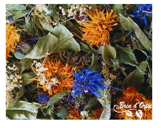 Menthe*, frêne*, ortie*, origan*, calendula*, bleuet*, fleurs de sureau*